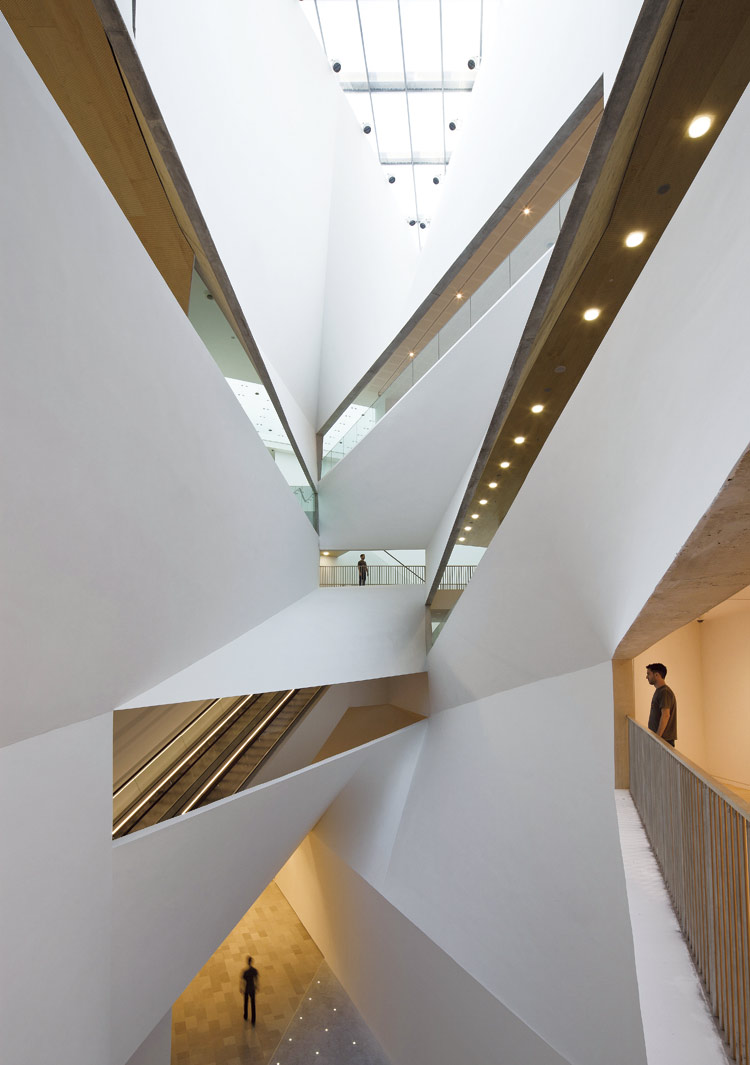 ![]() 项目名称:特拉维夫美术馆 设计者:普雷斯顿·斯科特·科恩建筑事务所 项目团队:普雷斯顿·斯科特·科恩(建筑设计);Amit Nemlich(项目建筑师);Tobias Nolte、Steven Christensen、Guy Nahum、Gjergj Bakallbashi、Bohsung Kong(项目助理)模型:Jonathan Lott(光线)、Isamu Kanda(环境) 渲染:Chris Hoxie(室外光线)、Agito Design Studios(室内和画廊) 竞赛团队:Scott Cohen、Cameron Wu、Andrew Saunders、Janny Baek 竞赛顾问:Ove Arup and Partners, Caroline Fitzgerald, Tom Dawes, Mark Walsh-Cooke(结构和MEP)、Hanscomb Faithful and Gould(预算) 项目顾问:YSS 结构咨询公司, Dani Shacham (结构咨询); Tillotson Design 事务所(照明设计); Hezkelevitch工程公司(承建单位) 项目地点:以色列 特拉维夫 建筑面积:18 500㎡ 委托人:Motti Omer, 特拉维夫美术馆馆长 设计时间:2003年—2007年 建设时间:2007年—2010年 本案的设计过程中着重解决了面积紧张且形状怪异的三角形基地与大量长方形可调节使用的展示空间之间的矛盾。轻微扭曲的表面(双曲线形)有机地连接了各个长方形展示空间之间不同的夹角,并将自然光反射至建筑最深处半掩埋在地下的空间里。整个建筑是根据层层旋转偏离的轴线而生成的。本质上这座建筑由一系列相互独立的体量和钢构架系统层层摞叠,再经由一条非比寻常的垂直空间流线连接成一个整体。 项目表达了对两种相反的元素的整合:中性的白色盒子和博物馆的壮观建筑形态。长方形的画廊围绕着“光之瀑布”——87英尺(27.3m)高的螺旋中庭分别布置。建筑通过多个轴线组织,使得层与层之间产生明显的偏离。简而言之,这是一系列独立的平面,在顶层通过钢结构串联,并且通过垂直流线的几何情节相互联系。 项目通过外形的相似性与老馆产生联系,同时,它也与以色列建筑文化传统中新的部分产生联系。特拉维夫美术馆的语素中包含着丰富的门德尔松和包豪斯的现代主义建筑语汇,使之更加国际化,并且反映了其文化源头的变迁。