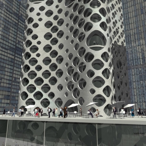 0-14大厦是一座高22层的商业塔楼,奠基于2007年2月,由占地300000平方英尺的办公空间构成,位于迪拜商业湾。0-14大厦坐落于迪拜河延长线上,由于其占领了显著的位置而使得它熠熠生辉。这是一座拥有双层幕墙的独特建筑,最外层的幕墙是厚达一米的孔状混凝土,在这一米的空隙内设计师通过结构和暖通的独特处理使其形成”烟囱效应”,以供整个结构主体的空调系统循环,降低能耗。该建筑由开发商Shahab lutfi直接委托RURarchitecture设计。