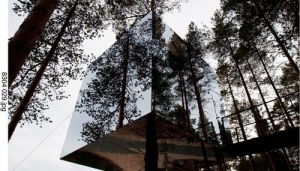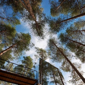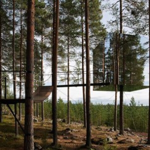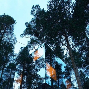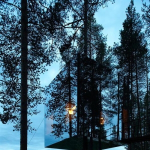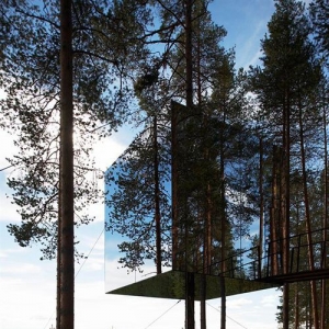 来源:美国室内设计中文网 建筑师:Tham & Videg?rd Arkitekter 地点:瑞典Harads 首席建筑师:Martin Videg?rd and Bolle Tham 合作者:Andreas Helgesson, Julia Gudiel Urbano, Mia Nygren 客户:Tree Hotel / Brittas Pensionat, Britta Lindvall and Kent Lindvall 项目年份:2008-2010 摄影:Ake E:son Lindman 树屋宾馆位于瑞士北部小村庄Harads的附近,接近北极圈。这是一个树上的避难所,悬挂在树干上的轻质铝结构,亦是覆盖镜面玻璃的4m×4m×4m的盒子。盒子外表面反射着周围的美景和湛蓝的天空,给人们创造了一个极具伪装效果的居所。室内全部由胶合板制成,通过窗户可以360°地观赏四周的景色。 树屋宾馆位于瑞士北部小村庄Harads的附近,接近北极圈。 这是一个树上的避难所,悬挂在树干上的轻质铝结构,亦是覆盖镜面玻璃的4m×4m×4m的盒子。盒子外表面反射着周围的美景和湛蓝的天空,给人们创造了一个极具伪装效果的居所。室内全部由胶合板制成,通过窗户可以360°地观赏四周的景色。 这个结构还暗示着人与自然的联系方式,以及人们在恶劣的气候条件下开发偏远地区时使用高科技材料和产品(Gore-tex、Kevlar、复合材料、轻质帐篷等)的方式。 树屋的功能是为两个人提供居住空间,包括一张双人床、一间小浴室、一间起居室以及一个屋顶露台。进入树屋要通过一条连接在旁边树木上的绳索桥。 为了防止小鸟撞到镜面玻璃上,建筑师在玻璃板上压入了一层透明的紫外线的颜色,这种颜色只有鸟类才能看到。