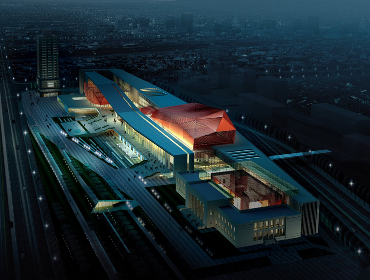 紧凑集约、多元复合——在相对狭小的场地内合理安排六大功能,通过平台、屋顶、连接体形成一个巨大的有机整体,达成形象鲜明、协调统一的效果。不同功能主体之间有紧邻和疏离等不同关系的处理,形成丰富的空间形态和多样的灰空间。