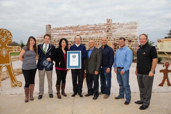 从英国伦敦赶来的吉尼斯世界纪录评判代表罗伯逊(Philip Robertson)近日宣布,这座一砖一瓦都由饼干和糖果打造的姜饼屋,以1110立方米的体积轻松击败此前世界纪录保持者——美国姜饼家建造的1019立方米的姜饼屋,成为现今世界最大的姜饼屋,吸引大批民众前来观赏,提前庆祝圣诞节。 建造这栋秀色可餐的房屋,得克萨斯A&M传统俱乐部在社会各界捐助和帮助下,历时1个月,动用了50多名建筑师、厨师、电工、屋顶工和设计家不停修建。