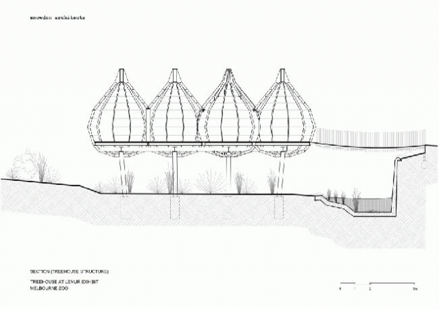 此次的设计项目位于墨尔本动物园,是一个新的狐猴展览馆设计,由景观建筑师和诠释设计师(Interpretive Designers)共同完成。该设计项目很好的诠释了景观建筑导与游客之间的互动关系,人们可以通过公园中现有的雨林小道进入展览馆,并且近距离的观赏狐猴及其生活环境。