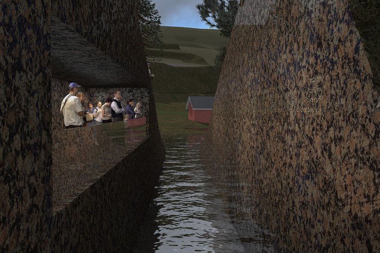 “伤口”将从场地内的海岬顶部划开,到达水位下方,延伸开来。游客们无法到达于特岛海岬的尽头,林木茂密的通道将引导游客到达地下的切口边缘。从这里的空洞可以看到无法触摸的石墙,框定出上面刻印的每个受害者的名字。