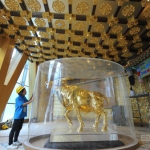 工作人员在江苏江阴华西村“新农村大楼”观看安放好的金牛。华西村的“华西增地空中新农村大楼”即将装修完工,1吨重的金牛(价值达3亿元)已安装到位。这座设计高度328米、74层的大楼总投资超过15亿元,名列中国第八高楼,为世界高楼第15位,并在今年10月份华西村建村50周年时投入使用。