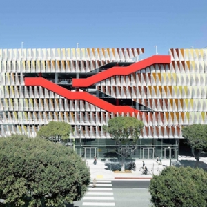 behnisch建筑事务所与jantzen工作室合作设计了“圣莫妮卡市6号停车场”,供洛杉矶海岸的居民及游客使用。该地区包含了多元化的活动,有零售商店,徒步行者,自行车爱好者,自驾旅行的人,植被景观,以及休闲放松的地方。停车场的高动态感和强烈的视觉冲击带给人们积极的能量。停车场的外表面由大量的彩色金属板拼成,其中还大胆的露出了一段楼梯,看上去就像一条断层。 外墙面上的孔隙起到调整内部光线的作用,使得外部光线深入停车场内部的同时又能去除其中的光增益和眩光效果。每部分拼板都包含两块三角形面板,一块为白色并且上面打满了孔,另一块则是彩色的,并且立在外面。光线正是通过外立的这块三角板的不锈钢镜面反射到停车场内部。除了功能上的这些特点,面板上的孔起到半透明的效果,使得停车场外的人可以看到场内的状况。 外部的楼梯将停完车的人们引领到“第二大街”上,那里进行着各种公共活动。楼梯被分成多段,从停车场外面可以直接看到。在上面的几层,楼梯延伸到建筑外面,站在上面可以看到远处的海景。 |