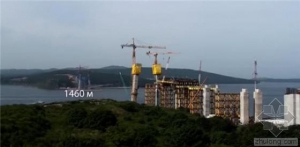世界第一斜拉桥“海参崴”跨海大桥 该桥的中心跨度长度——1104米,将创世界纪录,牵索长——580米。距水平面高度——70米。桥墩高度——324米。桥梁总长度——1885.53米(其中:1140米——中心河道跨度),引桥是总长度900多米的高架桥。高架桥桥墩为支柱式,高度从9米至30米。跨构为钢筋混凝土,由金属箱构成,金属箱是斜壁和整铸的钢筋混凝土板。车行道宽度——24米。上面可容纳4条车道(每一侧2条),每个桥墩的承台工事需要大约20000立方米水泥和大约30000吨金属结构。承台台身安装了应力计,用于监控该底座的状态。 |