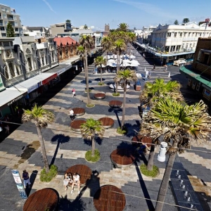 曼利科索的Manly(人性化)设计设计创造了一个开放而广阔的公共空间,其中包含五个可见的设计元素:波浪形的花岗岩道路、一排排随意种植的棕榈树、线型的水元素、高架线照明系统、独特的座椅和其他设施设计。 设计完成的场所能给人一种放松而且平等的感觉,同时给人一种强烈的视觉感受,让人们联想到科索过去的一连串景象。