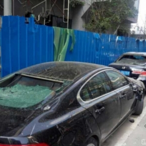 脚手架坍塌现场其中一辆黑色捷豹轿车受损严重,前后风挡玻璃全部碎裂,顶部受到“重创”,其他6辆车也不同程度“受伤”。