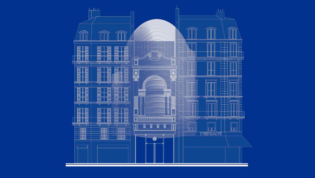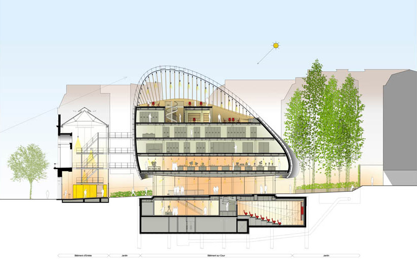 ↑从德戈布兰大街看新总部。Renzo Piano建筑事务所为百代电影遗产保护组织(百代基金会)所设计的新总部在2014年完工。建筑场地位于法国巴黎德戈布兰大道上一座十九 世纪废弃的剧院。建筑包含档案管理室,办公区,展览空间还有一个40座位的放映室。