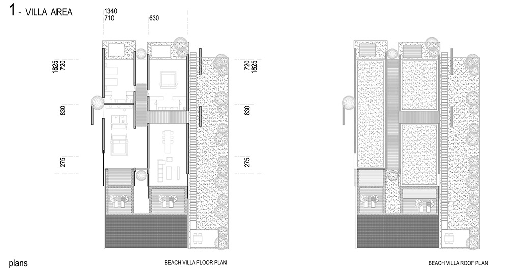 联排别墅位于相对空平坦的海滩区,每家每户的体量在前后都稍有错开,片墙成为限定空间的主要元素,定义出公开,半私人和私人空间。水 域在建筑前或者后展开,与片墙发生接触,成为一个渗透进入建筑的元素,将这片区域定义出永恒宁静的氛围。
