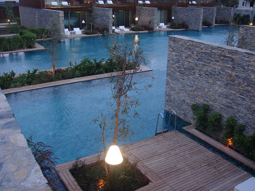 酒店建立在陡峭的山坡上,被茂密的森林、两条海湾和一个非常长的海滩所包围。它由东到西可根据树木,独特的植物,山坡,1987年在此区 域建造的Kiri世界酒店的残留建筑以及海湾和小海滩等等自然或人工要素分成具有不同特征的景观特色分区。