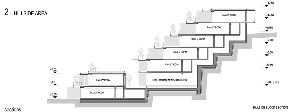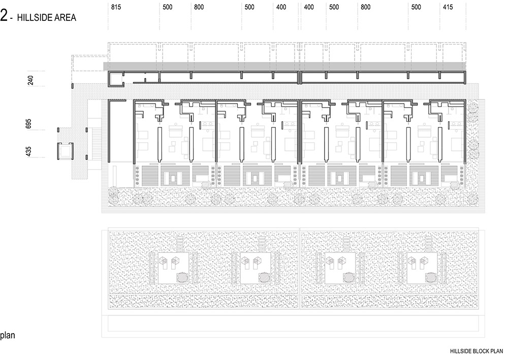 该区域的工作焦点为“修正”。也就是说,轻微的改变场地,在斜坡上作出梯田式平台安放建筑。利用当地的天然石材和木材,实现建筑与自 然环境的和谐