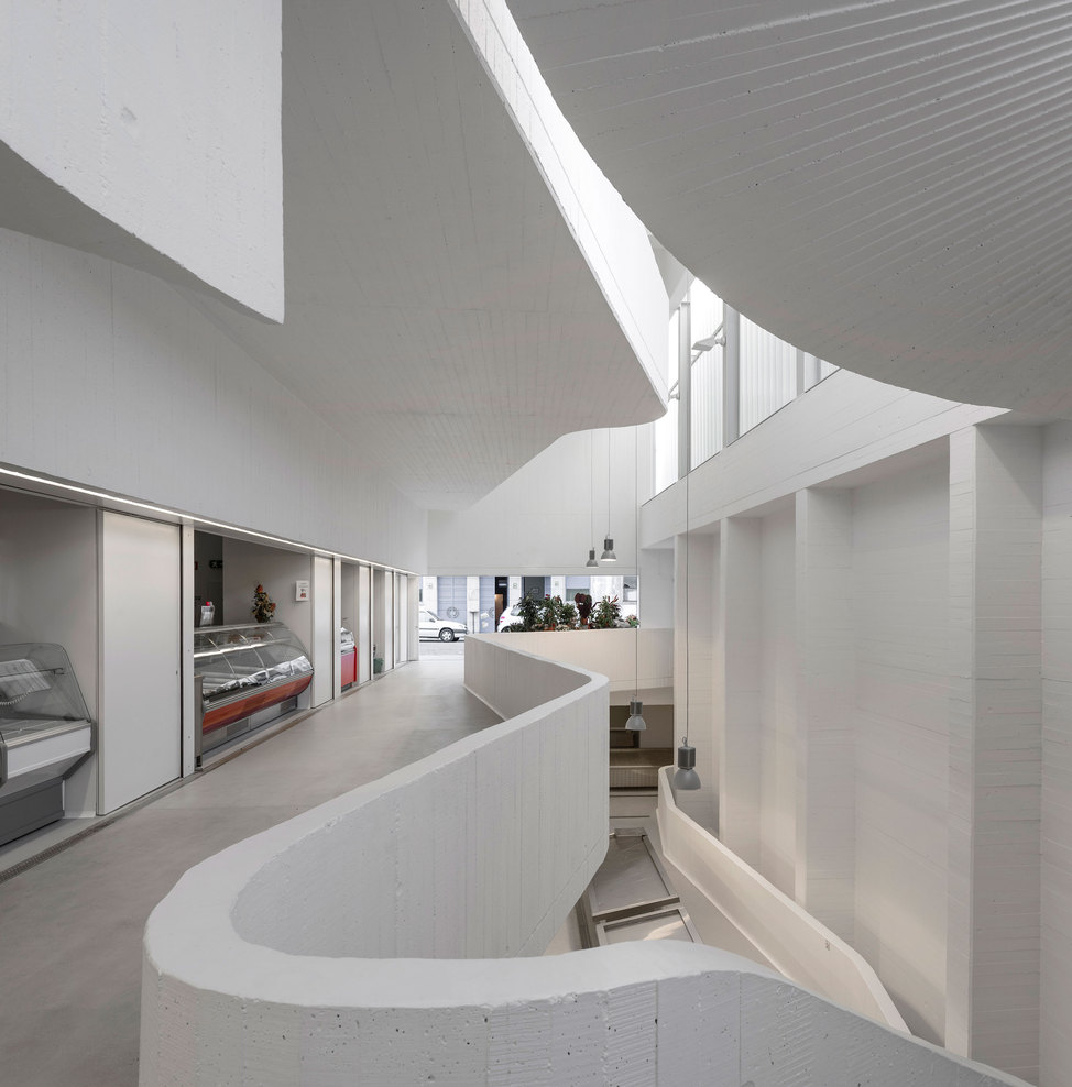 所以我们看到,建筑临街两侧都有进入建筑的入口同时还有一条连接两侧街道的通到入口,建筑内部一角设有一部楼梯,这一侧做了三层 挑空空间,屋顶的天光充分地筛入内部,非常明亮。整座建筑由外而内的白,内部空间像被搅动的冰激凌般纯粹。看到这里依然没有看出传统市场热闹杂乱的市井特点,反倒觉得像是一座由博物馆改成的临时市场……
