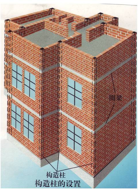 (1)钢筋混凝土圈梁,即在同一楼层面高度,沿纵横墙浇注一个闭合的钢筋混凝土梁。其配筋要求见表4。