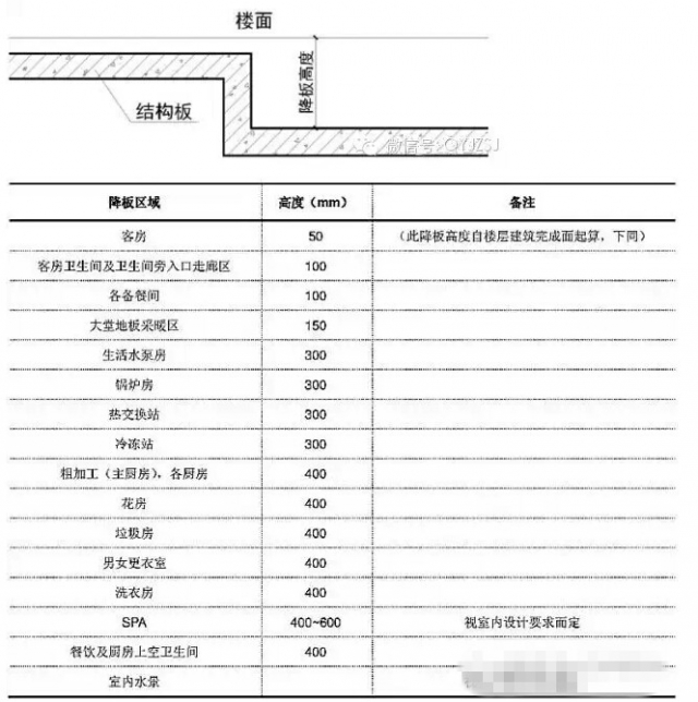 第三节结构降板要求 3.1. 大堂设地板辐射采暖,楼面降板。 3.2.全日餐厅、大堂吧、宴会前厅等长期有人停留、装修净高大于3m、并靠外玻璃幕墙的区域,幕墙内 3m 的条形地带,需设地板辐射采暖,楼面降板。 3.3. 泳池池岸、更衣室设地板辐射采暖,楼面降板。 3.4. 冷冻站、锅炉房、水泵房、水箱间等,利用垫层做排水沟,楼面降板。 3.5.各层厨房,特别是有推车进出的冷库下方,楼面降板。 3.6. 洗衣房水洗区,楼面降板。 3.7. 各层卫生间如采用同层排水,楼面降板。 3.8. 各区域降板高度:降板高度为从建筑面层到结构面的高度,见下图示意。