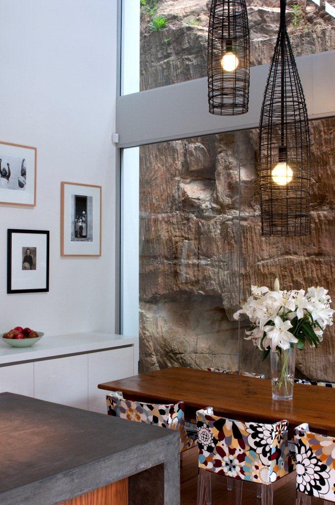 房间布置围绕着内庭院展开,庭院内有着原生态的植被和岩壁。 巨大的玻璃推拉门设置于主要的起居室区域,使得内外空间流动起来。 主卧室位于岩壁的最高位置,作为父母房间,同时这里有着鸟瞰起居区域的视野。