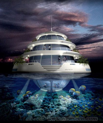 这个创新性的饭店度假村计划是由意大利的Giancarlo Zema设计集团完成的,是半沉入海中的一个工程,从陆地延伸到海洋中,因此被叫做“两栖1000”(Amphibious 1000)。与陆地平行一公里的是两只"胳膊"。陆地上的工程是几座住宅楼、办公楼和一座海港。所有的建筑以半圆的形制围绕着一座中心大厦建造,大厦顶端有一座可观看全景的餐厅。
