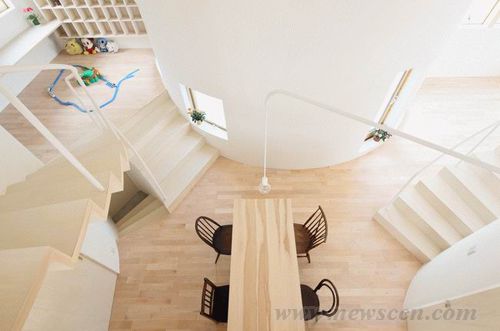 这个典型的日式建筑,除了采用典型的白色、木材等日式设计元素之外,设计师还别出心裁地设计了三面弧形墙,让住宅内外都平添了许多趣味。 这是位于日本岩手县的一处住宅,若不是因为它有着别样的残缺之美,恐怕也就是一栋日式风格的普通建筑而已。而所谓的“残缺之美”,从建筑的正面看你才能发现——正面中央向内凹进去了一个半圆形。这突然出现的“弧”来之笔让人想到了天狗吃月亮的典故,虽然略显突兀,却令住宅前方凭空多出了一个半圆形庭院,主人还在顶上悬挂了一根窗帘绳,必要时可以用帘子把庭院圈起来,于是这个半圆形的小广场变成了主人一家可随意支配的自留地。 这并不是唯一的一“弧”。在建筑的内部,还有另外两“弧”,那便是两面弧形的墙壁,将洗手间、卧室等私密区域包裹在内,不知情者恐怕会以为是两根大柱子。因为这两面弧形墙的存在,住宅内部被“挖”掉两块,留下中央的“人”字形loft 区域(“人”的两笔代表两面弧形墙)。有意思的是,设计师YukikoNadamoto 分别设计了两截楼梯,沿墙面的弧度盘旋而上,而两“弧”之间还被另一截如栈桥般的楼梯连接起来,木制楼梯与钢管扶手的结合本来就很有原生态味道,主人还在台阶上用盆栽装饰,上上下下有种野外攀登的乐趣。 这栋建筑楼高两层,还有一个地下室。一楼包括游戏区、厨房、饭厅以及工作区域。二楼则是卧室的所在。屋内的所有家具均采用定制的木制家具,与地板、楼梯的木材一致,而墙面则全部以纯白上色,是典型的日式设计风格。另外值得一说的是,因为这三面弧形墙的存在,无法安装大面积的玻璃窗,取而代之的是零散的小窗口,让人联想到那种挂钟上会有啄木鸟探头而出的小木窗。通过这些小窗口,主人一家也可以随时互通有无,或者享受躲猫猫的生活乐趣。 |