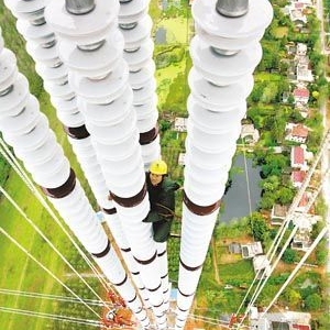 下午3时,记者开始攀登跨越塔。工地的安全人员给我们带上了保险带,再三强调注意安全。入口的铁塔角度大于45度,感觉每爬一个台阶,上面的台阶就会贴到脸上。 10米、20米,地面的建筑开始变小。100米,感到整个铁塔都在摇摆,工作人员不时提醒要抓紧扶手。 150米,喘着粗气喝着风,一个台阶休息一下,汗水湿透了衣襟。1小时40分钟后,记者终于登上了塔顶。 3名工人站在绝缘子上安装设备,远处的长江好像就在他们的脚下。工人们自豪地告诉记者,铁塔单基重1045吨,塔高242米,为目前世界上最高、单基最重的特高压大跨越输电铁塔。