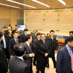 2月22日,巴基斯坦总统扎尔达里在三峡电厂左岸电站中控室参观。