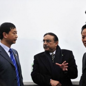 2月22日,巴基斯坦总统扎尔达里在三峡大坝坝顶与中方陪同人员交流。