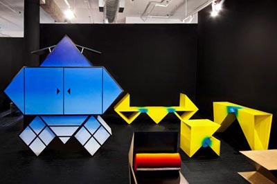 johnsontrading gallery画廊为纽约建筑师rafael de cárdenas举办了首个家具作品展览。下面一组作品的在风格上借鉴了bruce goff 和frank lloyd right,rafael用方块作为这一系列的基本形,通过旋转、镜像和增殖来丰富这一形态。每件作品都由一系列复杂的几何关系构成——方块被三角形和半圆形固定住——它们作为既是装饰性部件,也是必要的结构体。