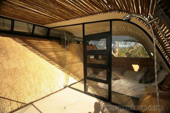 这座建筑位于一片密林之中,建筑师在材料的选择上保留了基地原有的自然特色,基本以天然的木材为主,但建筑的整体形式则偏向现代动感的风格。设计师沿建筑的长边设置了一个倾斜的平台,与包裹整个室内空间的钢框架形成鲜明对比。室外平台与新加建的卧室相连,两个空间通过弧形排列的竹棚融为一体,形成了极具穿透性的户外阳光房。