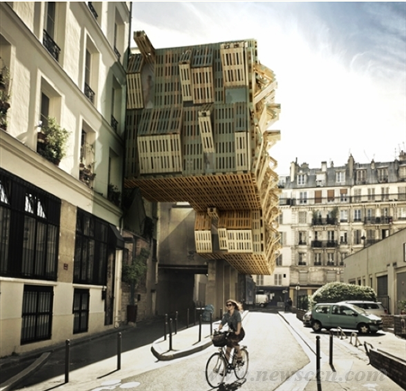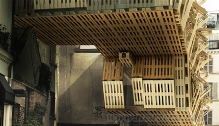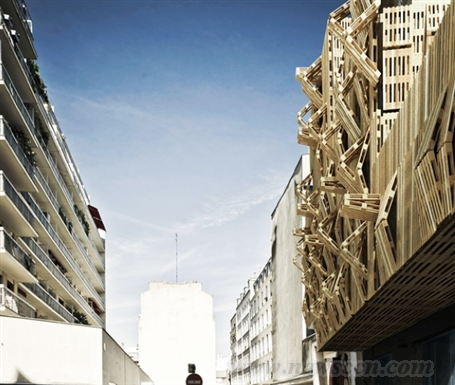 Amelot学生公寓就是加建在城市建筑中的一项建筑:它利用的无窗墙的厚度。这座“单薄”的建筑就是建造在无窗墙上。 这样建造学生公寓,既没有毁坏周围的建筑,也没有产生任何的污染。建造建筑的材料使用的是木托盘。木托盘使用水平铰链结构支撑,一直延伸到顶端,这样就可以提供一定的隐私空间和开阔的空地。各种各样调色板的模块性营造出不同的几何结构,这是通过大量的木托盘来实现的。