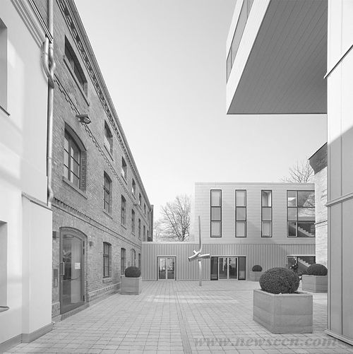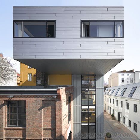 罗兰·哈尔比拍摄的这些照片展示了德国建筑师事务所NPS特科班·沃斯设计的一座综合楼。这座位于柏林的建筑以其“悬臂”于另一建筑屋顶而出名。该五层建筑由金属面板覆盖,包含底楼的画廊、两层楼的办公区域和一个错层公寓。今天的汉堡霍夫综合楼是在过去200年间不断发展、不断重组形成的住宅和商业两用楼。其首先被记载于1828年。从2006年开始,当客户在获得这个多样式建筑的所有权时,他倾向于继续这种工艺、文化和住房混合式的发展。这个建筑已经成长为目前的面貌。 在与警戒保护机关密切合作中,一个改建和扩建的综合概念形成了:仅仅从1960年的建筑上去除两个小部分。设计师谨慎添加了大面积的玻璃阁楼,部分恢复了在第二次世界大战中毁掉的屋顶垂檐部分。 在这个大建筑群中唯一一个全新建筑部分是毗邻现有防火墙的一座五层楼。该建筑顶层向外广泛延伸至后面毗邻的公园,覆盖邻近砖房的角落并偏向于古老的咖啡烤面包店。这个综合楼上层的新门窗布局提供了壮观的户外景色。而古老的庭院通过这个明显的新布局得以重塑——采用了现代的材料和形状但也保留了其作为一个半私人空间的特点。 |
