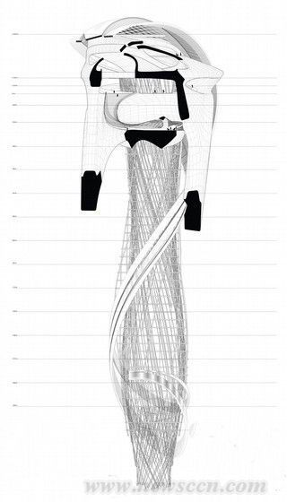 这座概念摩天楼取名为“垂直的飘带(Vertical Strip)”,将提供娱乐场,酒店,拳击场,以及音乐厅等功能,类似于毗邻的拉斯维加斯大道(Las Vegas Strip)。轻质的碳纤维结构将悬挂在混凝土悬臂上,由盘旋的金属外壳支撑。大楼位于大坝与过桥之间,所以汽车和行人很容易从毗邻的路上到达建筑。