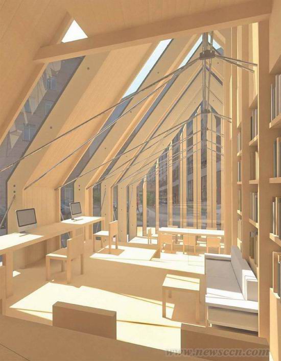 “屋顶住宅”是俄罗斯建筑事务所architact为一个公司设计的极简主义办公空间。建筑师采用具有俄罗斯风格的建筑形式,通过分段式的立面设计,让建筑外部的步行者和室内人员建立视线交流,从而与这一地区稠密的城市环境形成呼应。交错排列的木板和玻璃材料既提供了充足的自然光线也保持了一定的私密性,为室内工作人员提供了一个理想的办公环境。 这座建筑完全是由木框架结构建造的,立面材料也选用了层压胶合木板。结构框架由金属连接件固定,并采用了无框架玻璃窗。工作区上部的拱形天花板直接由暴露的钢拉杆连接固定。南立面设有一个自动木百叶,它围绕一个垂直轴承转动,可以部分关闭或全部关闭以遮挡阳光直射。