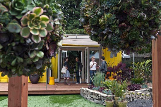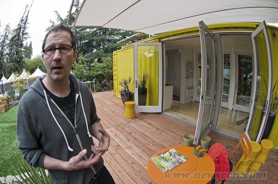 美国加州门罗公园市展出富有时尚环保特色的集装箱房屋。一个其貌不扬的旧集装箱可以改建成雅致实用的现代化房屋,不仅坚固耐用,功能齐全,更符合环保绿色概念,兼具时尚及个性,为民众提供居住多样化选择。美国西雅图建筑设计师乔伊·伊甘和罗伯特·罕柏共同设计的这个集装箱房屋,17.8平方米,落地玻璃窗,竹木地板,有两张可折叠双人床,厨卫齐全,用太阳能提供用电和热水,售价7.2万美元。图为设计师乔伊·伊甘和他的作品。