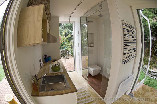 美国加州门罗公园市展出富有时尚环保特色的集装箱房屋。图为房屋内部的厨房和洗手间。 |