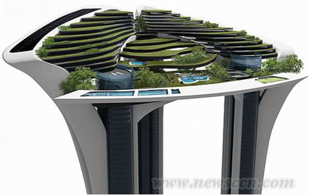 沿着三条”腿“,种着闪亮的草,并散发着绿色自然的香味,使整个建筑锦上添花。大厦顶层的生活区域到处是绿草,植被和树,俨然一个城市上空的天堂。这个区域是为了在大厦里活动的人提供一个放松和休憩的场所。游泳池、餐馆、运动中心、SPA、雨水收集池、太阳能发电…所有这些无疑使大厦充满了后现代幻想,让钟情于绿色科技和建筑的人士喜爱至极。 |