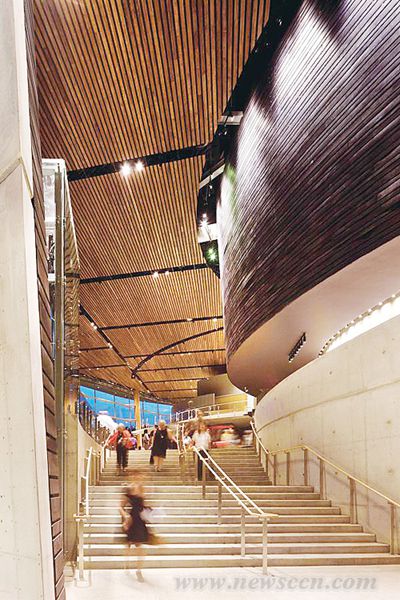 谭秉荣(Bing Thom)保留了一系列20世纪中晚时期设计建造的剧院,同时将一个华盛顿文化机构升级到一个必看之处的地位。 美国的审美保守的资本主义偶尔会由于一个独特的新建筑,产生一次基于设计的波动。华盛顿最新的建筑,美国剧院米德中心竞技场舞台来自于美国建筑师协会的谭秉荣对一个城市最古老文化机构进行的一次根本性改变。米德中心位于一个高密度的三角区域,俯瞰华盛顿西南的波托马克海滨,其戏剧雕塑品质是理性并且具有目的性的,而非任意或异想天开的。其具有启发性的特殊形式涵盖了一个同样特殊的项目,在功能、美学和都市化方面都运作良好。 由于这一新结构并没有效仿其周围建筑,因此有人质疑米德中心与华盛顿西南地区城市环境的兼容性。它不模仿是因为它不必模仿。附近大多数建筑的风格都是兼收并蓄的,规模和功能各异,但是结构上却平淡无奇。同时,这一区域是不断变化的,在另一个10年到来时将会非常不同。在相邻的海滨,那些过时的1960年代的老式低层商业大楼和停车场很快就会被多层的、多功能大楼所取代。该地区的其他重建项目正在建造或正在规划中。事实上,米德中心推动了该地振兴。同样重要的是,它既是该城市的公民大厦,也是该国的文化资源。作为与众不同的魅力建筑,它是与其环境完全吻合的。 欣赏这一创新改造需要了解一点竞技场舞台的历史。坐落于缅因大道和第六街西南的交界点,竞技场舞台原本是一个独立的、可容纳800座席的圆形剧场,由哈里·威斯在20世纪50年代设计。该剧院在建成后成为20世纪中期现代华盛顿建筑的着名代表:裸露的混凝土结构、砖包层、庑殿式金属屋顶。在1971年,该剧院有了一个姐妹剧院,由威斯设计的可容纳514座的柯里格剧场,它是一个扇形的镜框式舞台。虽然大厅狭小不堪、技术手段过时并且后台内部设施严重短缺,但是几十年来,剧院也依然拥有了忠实的观众。因此改变已经迫在眉睫。 根据竞技场舞台的艺术总监莫莉·史密斯的描述,所发生的一切都是一次“惊险刺激的探险”:设计需要重新确立竞技场舞台的使命,需要应对具有挑战性的场地和设计问题,并需筹集1.35亿美元。史密斯说,超越其作为一个地区剧院的角色,竞技场舞台旨在成为美国剧场中的“国家级中心”。除了展示当地和巡回表演作品,它将促进戏剧创作的发展,并作为研究美国戏剧史的一个场所。但是,扩展的愿望也需要以项目和空间的扩展为基础。由于其场地的狭小、奇特形状,剧场考虑重新选址。但是意识到其位于一个不断变化的区域,邻近地铁站,并且该地区已构成竞技场的一部分历史和身份,董事会决定留其在原址。董事会还决定保留既有剧院并使其更为现代化。 对位于加拿大不列颠哥伦比亚省温哥华的谭秉荣建筑事务所(BTA)来说,要建筑化地实现该中心的使命需要调整其整个20万平方英尺的空间。除了以纪念其创办人的已更名为费香德勒的舞台和柯里格剧场的竞技场舞台,其他现存的一切都将被拆除,同时添加了一个200座的新实验剧场——阿琳和罗伯特·寇德的摇篮。全新的后台设施和宽敞的公共空间是必需的。今天3个剧院的1397个座位与原来两个剧院的座位数(200个竞技场包厢座位被淘汰)大致匹配,并支持3个表演场地。 有两种设计方案是可行的:创建一个高密度聚集化的“村庄”,不同的新建和既有结构由公共和后台内部流通网络相互联系起来;或者用一个统一形式兼容新建和既有结构。谭秉荣选择了后者,采用了一种独特的英雄式姿态:一个弯曲的、475英尺长的悬臂式屋顶横跨整个场地。该蜿蜒屋顶明显地弯曲化,场地西端突出的尖角朝向华盛顿纪念碑。尽管缺乏先入为主的风格意图,该姿态产生于场地和项目条件之下,同时具有象征性和实际意义,这种大审美是埃罗·萨里宁开创的。 屋顶的蜿蜒姿态被起伏的落地玻璃幕墙所放大增强,玻璃幕墙略微向外倾斜,环绕整个朝向街道的墙面,优美地展现了建筑的外部形态。由单板条平行胶合材、复合木材门窗中梃和支柱支撑幕墙的370块玻璃面板构成了屋顶,并从屋顶悬挂而下,用钢桁架做边框,看起来就像是漂浮的一样。这一钢屋顶结构由18根椭圆形的单板条平行胶合材立柱所支撑,幕墙门窗中梃固定在立柱上。据谭秉荣说,这一玻璃、木材、钢材建筑组合在美国是前所未有的。落地玻璃幕墙展示了建筑物内部的结构和人们的活动,同时里面的人可以欣赏城市、河流和照耀西边天空的落日全景。到了晚上,这一建筑的艺术感觉是最好的,灯火辉煌、闪闪发光。 抽象化的细部形式在场地的西部顶点和东部边缘处体现并投射出来。例如,在第六街的主要入口附近,一个椭圆形混凝土圆筒从人行道上突出上升至楼顶高度,包含了寇德的摇篮和延展进剧场的螺旋坡道。该圆筒和其他众多组成部分是成功的,成为表现该建筑主体屋顶和玻璃幕墙的审美锚点和视觉焦点。该中心的丰富特点通过内外一致的细节和材料得到加强,混凝土地板在公共区域变成了水磨石,墙面和护栏是混凝土、玻璃、木材和金属相结合的。 该中心的流动公共领域是一个充满活力的地方,值得一看。剧场周围和其之间的所有自由活动空间,包括柯里格顶部的高架咖啡馆露台,都在新横跨式屋顶的庇护之下。然而,从咖啡馆露台上看过去,费香德勒的屋顶和新屋顶之间的空间被