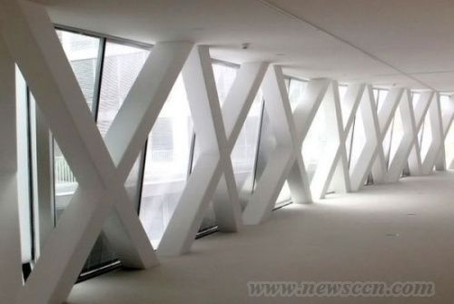 开放的屋顶区域是由偏移的体块形成的,上面种植了绿色植物,作为屋顶花园使用。建筑向街道大面积开放,商务中心的设计在各个方向都保持一定的透明性。设备管线故意避开了墙体,以减少人们的交流壁垒。方案利用钢架结构来承载整个体量。使用了k形和X形肋板来支撑,从街道上就能看见办公室空间边缘的结构框架。而暴露的钢结构体也成为室内装饰的元素,延续整个设计的主题。
