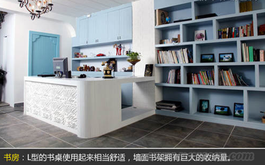(1)书房:定制的墙面收纳柜,使得空间看起来整齐完美,同时还不忘在天花门框细节上加入拱形元素,从颜色到细节呼应着地中海风。