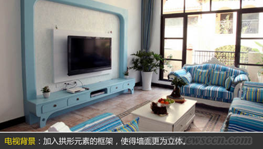 (1)电视背景:电视没有一整面铺,而且简单的设计了一个外正方内拱形的框架,与电视柜融合为一体,既有层次感又充分体现了风格。
