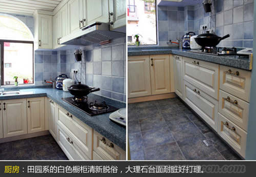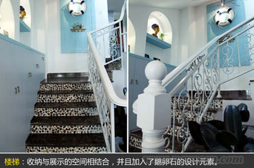 (4)楼梯:收纳展示一举两得,白色楼梯倍显优雅,白色柜体尤为突出,鹅卵石的元素照应的阳光沙滩海水。 PART2:小两口的一楼公共区域 设计需求:要把地中海风格体现得浓郁些 展示空间:客厅、餐厅、厨房