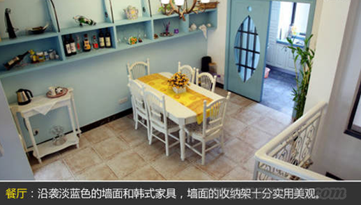 (3)餐厅:客厅走出来便是餐厅,白色韩式的家具,一整排的墙面收纳架,解决了大片空白的墙面,也是餐厅收纳的好帮手。