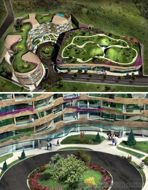 这个名为“One &Ortakoy”的多功能建筑群位于土耳其的伊斯坦布尔。它拥有弯曲的有机形态以及被绿草和鲜花覆盖的起伏屋顶,与所在的美丽山区融为一体。这个建筑群位于奥尔塔科伊附近地区,现正在建造之中。它由两座建筑构成,正面使用天然石头打造。其中一座是住宅建筑,另一座则是商用建筑。 4.法国绿屋顶中学