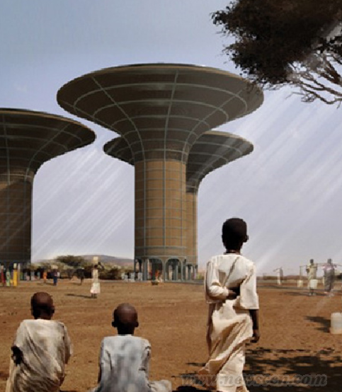 在面积广阔的苏丹沙漠,淡水成为最宝贵的资源之一,获取淡水的难度超乎人们想象。有意思的是,沙漠地下深处也隐藏着世界上最大的地下湖,如果能够有效加以利用,当地居民的生活便会发生翻天覆地的变化。波兰建筑事务所H3AR提出了一种解决之道,即建造外形好似当地猴面包树的水塔群并利用地下泵抽水。水塔内建有一个水处理厂、一所医院、一所学校以及一个食物储藏中心。 6.集雨摩天楼