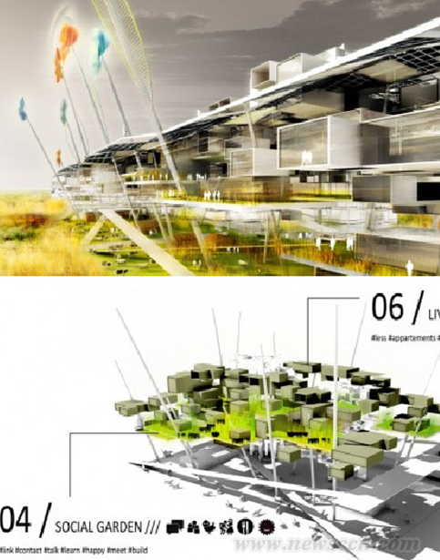 如何让建筑在最大程度上收集雨水?H3AR设计的集雨摩天楼可能给出答案。借助于覆盖整个外部的水槽网,雨水将直接流入一个处理厂。处理后获得的生活用水可用于冲马桶、洗衣服、其他清洗工作以及浇灌植物。根据H3AR的设计,摩天楼的皮肤与屋顶上一个巨大的碗状雨水收集设施结合在一起,在最大程度上获取雨水。 7.法国第戎多功能生态区