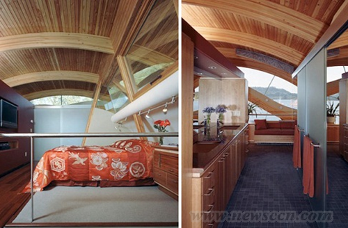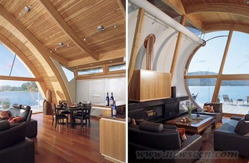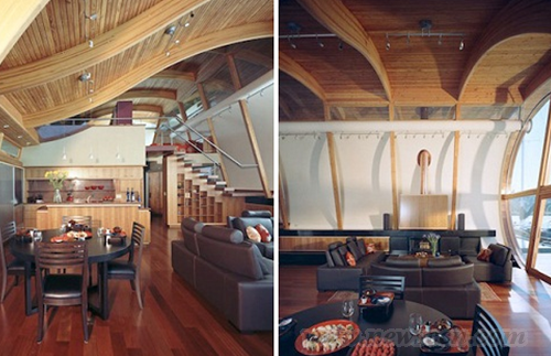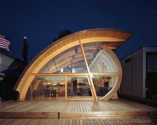 现在的国际大都市都是差不多的摩天高楼,四方规矩、耸入云霄,让人顿生厌倦。但在俄勒冈州的波特兰,建筑师 Robert Harvey Oshatz 从河流的波浪中获得灵感,设计出优美飘逸的曲线,完成了这栋仿佛在流动的住宅。原木和玻璃的大面积使用,让它显得温暖而静谧。从宽敞的甲板上,还能够欣赏到旁边的河流美景。这“突然”出现在千篇一律的水泥森林里的“波浪住宅”,大概会让偶然路过的人大大惊喜一把吧。