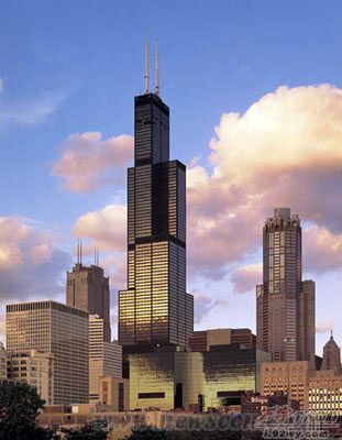 这是一座LEED金牌认证的绿色大楼。该建筑是为了最大限度地利用日光,同时尽量减少太阳热量的吸收。。芝加哥最大的Kirkland & Ellis 律师事务所 租用了这幢楼的28个楼层。 3、Willis Tower (原西尔斯大厦)