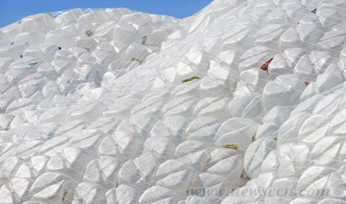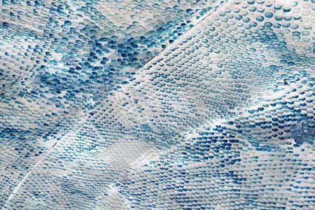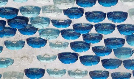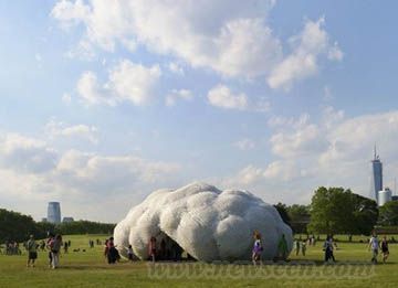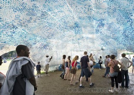 参观者可以进入这个空间内参观各种灯光和色彩从表面、内部和外部等多个角度漫射下来的效果。亭子的外部由很多形似枕头的牛奶罐构成,而内部则是由0.45千克或0.68千克的瓶子组成。这些瓶瓶罐罐在有机食品的烘托下创造出蓝色的内部色调。沙子、水、弧形的铝框架为内部结构提供支撑,为大约50个观众提供了小型的观看空间和座位。