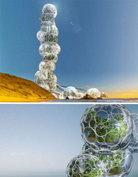 这家淡水工厂由一系列堆叠在一起的生物圈构成,从外观上看,它好像是一堆肥皂泡。这是一座怪异的高塔,其玻璃圆顶结构扮演着至关重要的角色,能够利用红树过滤海水以获取淡水。红树可吸收咸水中的物质并渗出淡水。宝贵的淡水钻出红树体外后蒸发并凝结成露水,工厂内的淡水池则负责收集露水。 |