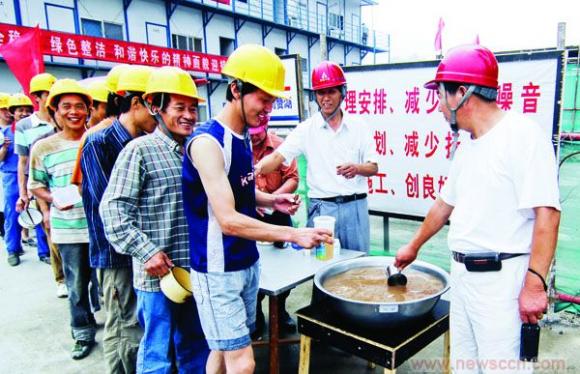 7月5日,北京市气象局发出今年首个高温橙色预警信号。当天下午,北京城区最高气温达40.3摄氏度,地面温度超过55摄氏度,创下近60年来同期最高纪录。 高温让不少北京市民选择躲在空调房里避暑,而在北京地铁大兴线施工现场,记者看到工人正在进行隔音墙钢结构施工。在太阳的炙烤下,隔音墙的钢结构框架如同加热的饼铛,还未靠近,就能感觉阵阵热浪袭来。为了保证地铁在今年底前通车,工人们顶着酷暑加紧施工。在北京崇文门附近某工地上,工人们也在烈日下坚持施工。 酷暑里的清凉 为应对高温天气,北京一些建筑施工单位调整了作业时间,12时~15时停止露天作业。记者在采访中发现,很多项目部都采取了防暑降温措施。比如,北京建工集团某项目部给工人发放矿泉水和防暑药品,北京住总集团六公司某项目部给职工提供绿豆汤、藿香正气水、人丹等,北京地铁大兴线项目部给工人发放冰镇矿泉水。 ![]() 广渠路一号工地每天给职工提供绿豆汤 ![]() 给工人发矿泉水 |