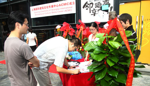 7月2日下午四点,由上海市建筑学会主办,上海国际建筑文化传媒中心(ACMC)承办的ACMC成立仪式在ACMC常设基地——“建筑师的咖啡馆”(位于海上海创意园 飞虹路568弄17号)隆重举办,同期举办ACMC建筑画廊首展——沈忠海•世博建筑摄影展,及上海建筑界高层酒会。 在7月2日这一天,筹备多时的ACMC正式在世人面前揭开面纱,20位政府领导、70位国内外设计企业领导、20家媒体等120多位建筑界高层及相关人士为此济济一堂。