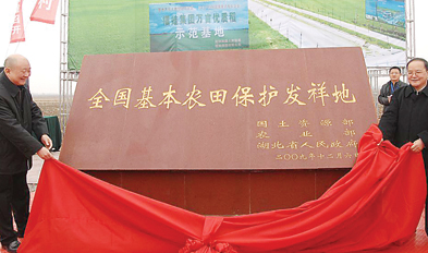 2005年10月,国务院办公厅发布《省级政府耕地保护责任目标考核办法》,建立了对地方政府耕地保护责任目标的考核制度。目前,绝大多数地方政府层层签订了耕地保护责任书。与此同时,加大了联动协调,加强了相关部门的共同责任。国土资源部会同农业部、国家统计局等部门连续3年开展对省级政府履行耕地保护责任情况的检查考核,形成了固定运作机制和职责分工;多数省份国土、农业、水利等部门联动、协作不断加强,共同加强对补充耕地的管理和指导;许多省份财政、审计、监察等部门加大对土地整治等工程建设、资金使用和管理的保障和监管力度。 “十一五”期间,通过严格执行补充耕地以项目形式实施、建设项目与补充耕地项目挂钩制度,实现了“占一补一”。2006—2009年,全国共补充耕地面积1600多万亩,多于同期建设占用的1250多万亩耕地,做到了占补有余,稳定了耕地面积。实现了耕地的“先补后占”和“边补边占”并存局面向全面实行“先补后占”的转变。 2008年以来,国土资源部与财政部联手相继在吉林、新疆、宁夏、黑龙江、青海、湖南、湖北、云南和河南等国家粮食核心产区和后备产区以及汶川地震灾区实施土地整治重大工程。2010年,国土资源部会同财政部分别与河北、内蒙古、吉林、黑龙江、江苏、安徽等省(区)签订协议,支持开展农村土地整治重大工程和示范建设。10个重大工程及10个示范建设区,计划投资1000多亿元,用5年左右时间整治土地6000多万亩,补充耕地约1000万亩,提高粮食产能200多亿斤。 各地推进征地补偿新标准的实施。按照国务院要求,从2005年起,各省(区、市)陆续制订了征地统一年产值标准和区片综合地价,到今年9月,已有28个省份公布实施了新的征地补偿标准,补偿水平普遍提高20%—30%,有的省份提高幅度在1倍以上。同时,各地建立征地补偿标准动态调整机制,根据经济发展水平、当地人均收入增长幅度等情况,每2—3年对征地补偿标准调整一次,逐步提高征地补偿水平。 图为国土资源部党组副书记、副部长、国家土地副总督察鹿心社(右)与湖北省人民政府副省长田承忠共同为在监利县设立的”全国基本农田保护发祥地”纪念碑揭牌。 |